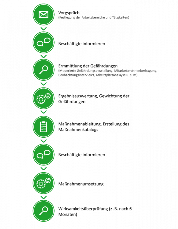 - Ermittlung der Gefährdung (z. B. Mitarbeiter:innenbefragungen, Interviews, Analyseworkshops, Begehung der Arbeitsplätze)